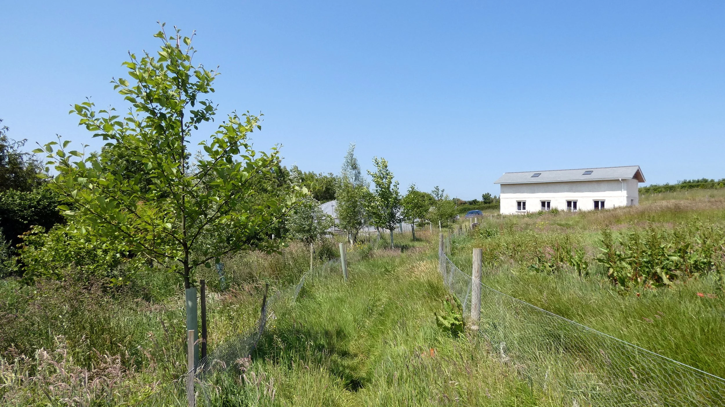 Half of this highly productive 2 hectare speck of space in south Devon is a border of 1, 700 of 11 mixed species trees for our forest garden. We also have a 100 tree orchard of locally sourced fruit trees and community growing spaces.